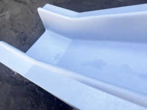 少し月をまたいだ前の工事のお話になりますが、保育園にあるすべり台の塗装を承りました。塗装前はコンクリートのごつごつした表面で、サンダーで凹凸を削るところから始めました。