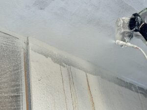 本日はタイトルの通り、リシンの吹き付け塗装を行いました。