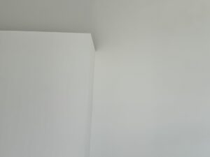 仕上がりの写真を撮ってみると、一面真っ白です。照明や自然光などが当たると反射で塗りの状態がよくわかるので、ムラのでないよう、丁寧に塗装をすすめてまいりました。